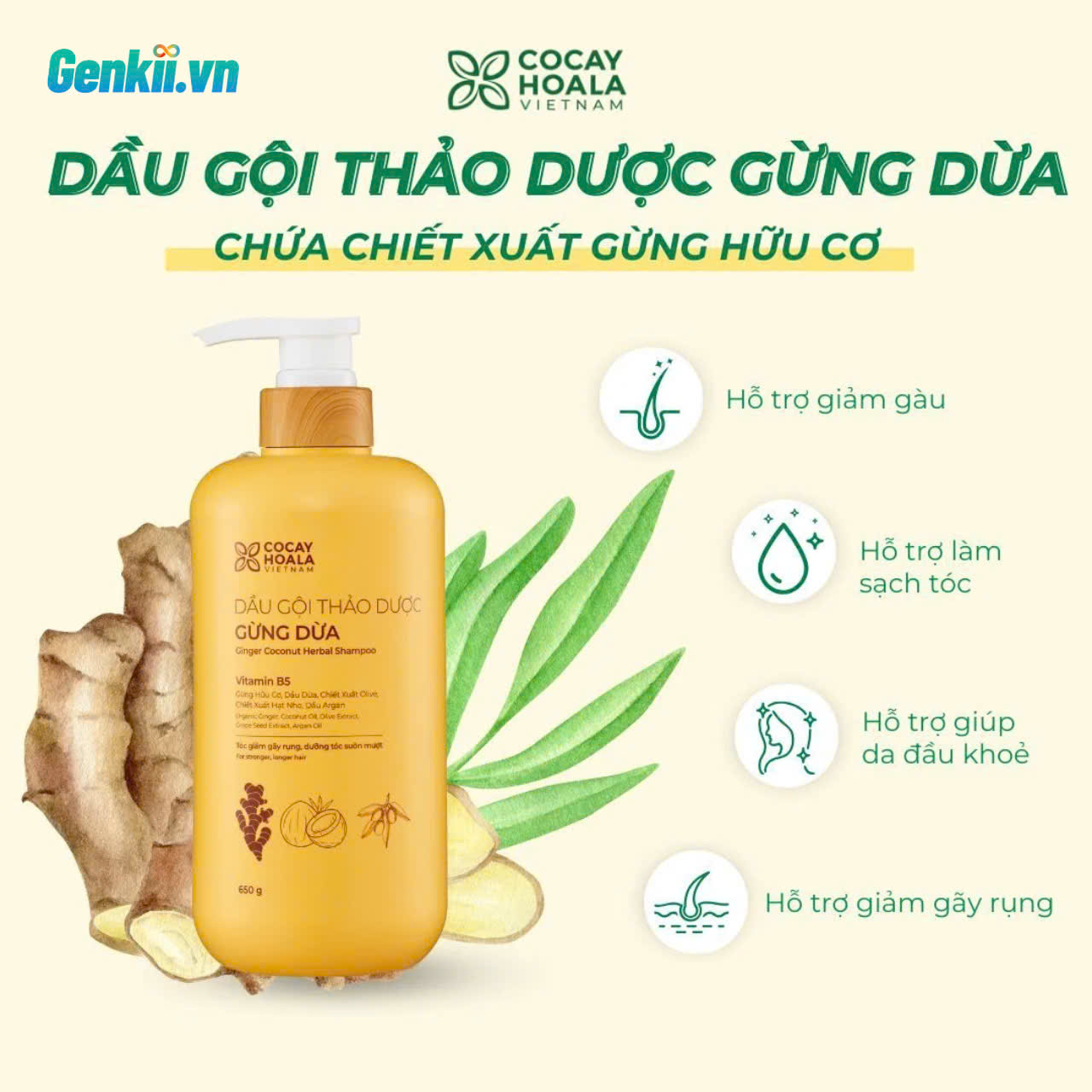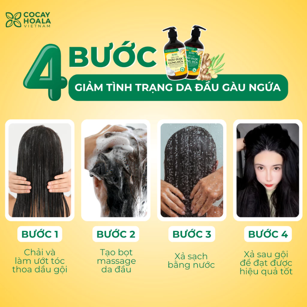 Dầu Gội chứa chiết xuất Gừng tươi giàu Gingerol, giúp kích thích lưu thông máu dưới da đầu, giảm gãy rụng và hỗ trợ mọc tóc mới. Dầu Dừa nguyên chất cung cấp độ ẩm, dưỡng tóc bóng khỏe và phục hồi hư tổn. Bồ Kết và Sả được bổ sung để làm sạch tự nhiên, giảm ngứa, ngăn gàu hiệu quả. Ngoài ra, chiết xuất Lô Hội và Vitamin E giúp cân bằng độ ẩm, làm dịu da đầu và tăng độ đàn hồi cho tóc. Tất cả thành phần đều có nguồn gốc thảo dược, không chứa Sulfate, Paraben hay Silicon.