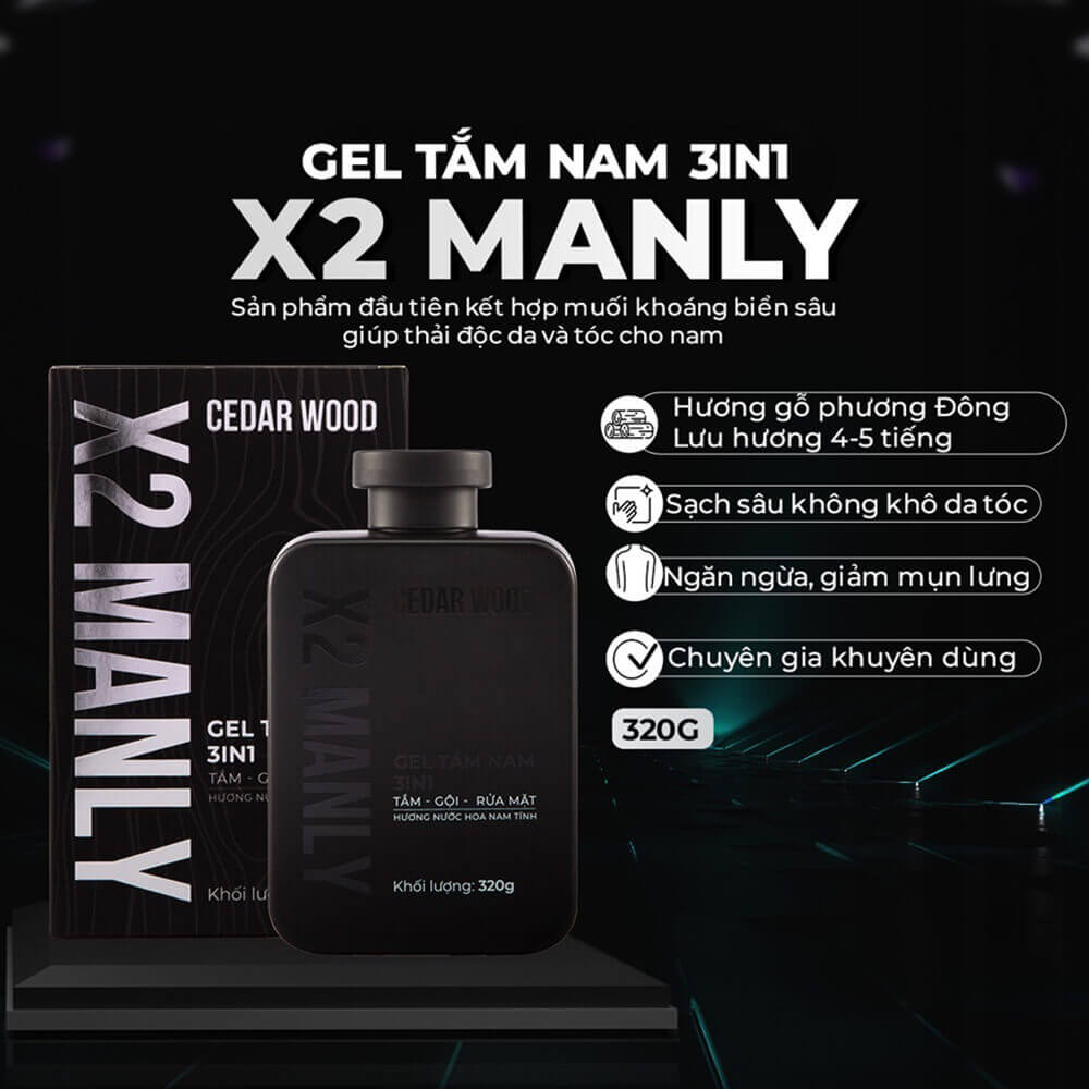 1. GEL TẮM NAM 3IN1 X2 MANLY (320G) – HƯƠNG NƯỚC HOA, THẢI ĐỘC DA, NGĂN MỤN LƯNG