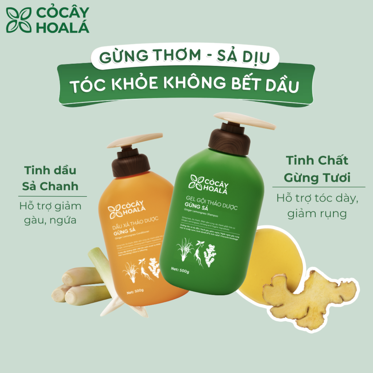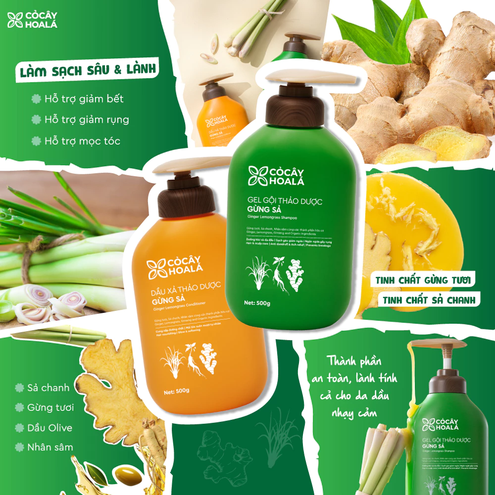 ghhTên sản phẩm: Dầu Gội Thảo Dược Cỏ Cây Hoa Lá Gừng Sả Dung tích: 500g Thành phần chính: Gừng Tươi, Sả, Tinh Dầu Bưởi, Lô Hội, Vitamin E Công dụng: Làm sạch sâu, kiềm dầu, ngăn bết tóc, giảm gãy rụng và nuôi dưỡng tóc chắc khỏe Hạn sử dụng: 3 năm kể từ ngày sản xuất (xem trên bao bì) Sản xuất bởi: Thương hiệu Cỏ Cây Hoa Lá – Việt Nam Tiêu chuẩn sản xuất: GMP – An toàn, thiên nhiên, thân thiện với môi trường