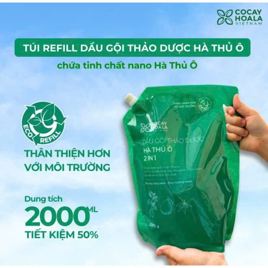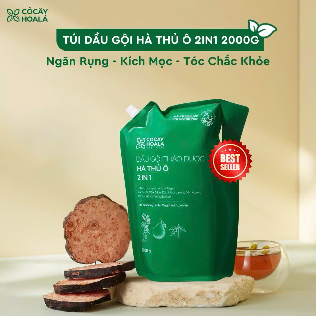 8. Thông tin sản phẩm Tên sản phẩm: Dầu Gội Thảo Dược Hà Thủ Ô 2in1 Cỏ Cây Hoa Lá Dung tích: 2000g (dạng túi refill) Thành phần chính: Hà Thủ Ô, Bồ Kết, Gừng, Tinh Dầu Bưởi, Lô Hội, Vitamin E Công dụng: Làm sạch da đầu, giảm gãy rụng, kích thích mọc tóc, dưỡng tóc đen mượt và chắc khỏe Hạn sử dụng: 3 năm kể từ ngày sản xuất (xem trên bao bì) Sản xuất bởi: Thương hiệu Cỏ Cây Hoa Lá – Việt Nam Tiêu chuẩn sản xuất: GMP – an toàn, lành tính, phù hợp sử dụng hằng ngày