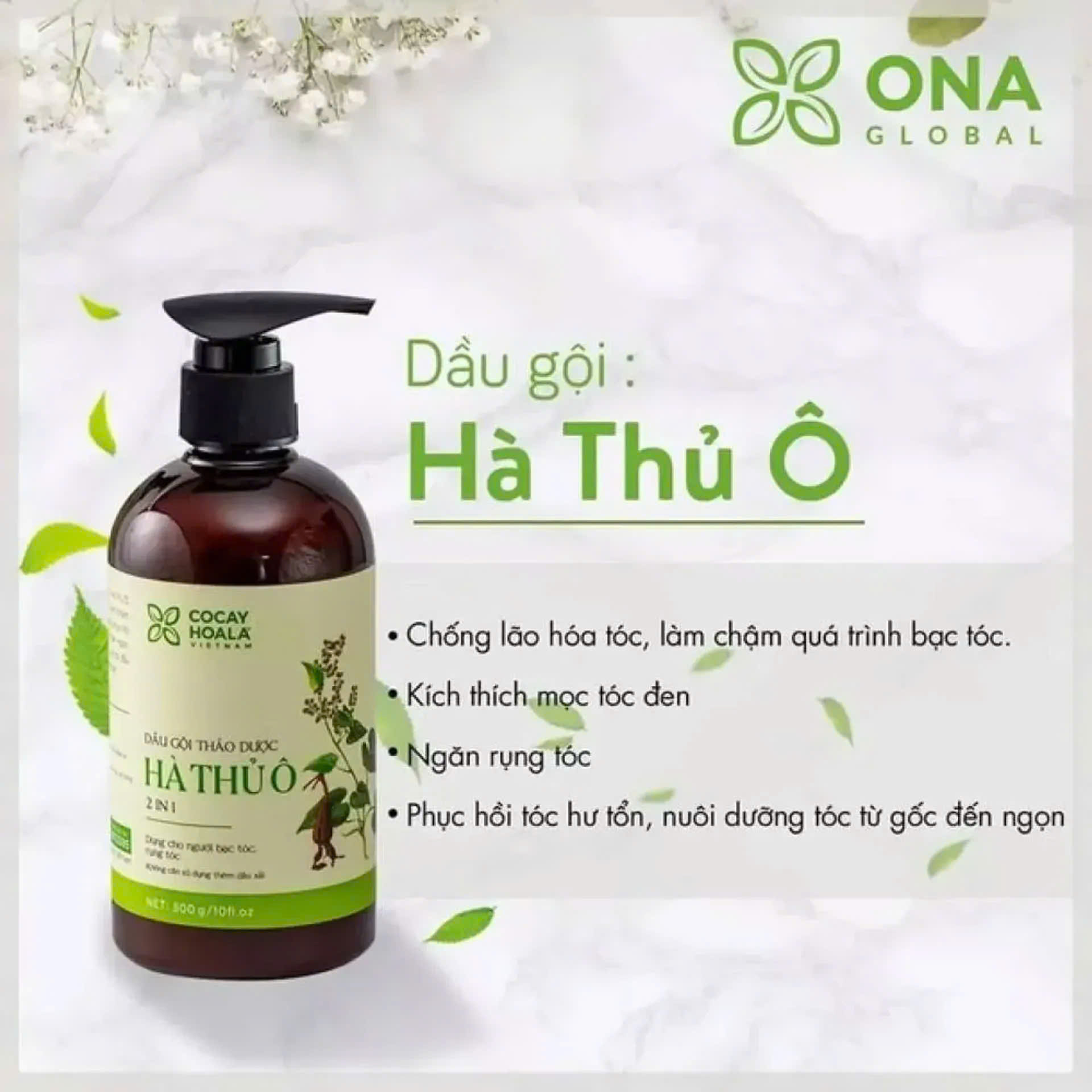 Dầu Gội Hà Thủ Ô 2in1 được chiết xuất từ các thảo dược quý như Hà Thủ Ô, giúp làm đen tóc, ngăn bạc sớm và nuôi dưỡng chân tóc chắc khỏe. Bồ Kết chứa hoạt chất saponin tự nhiên giúp làm sạch da đầu, loại bỏ bụi bẩn và dầu nhờn. Gừng tươi kích thích tuần hoàn máu, thúc đẩy tóc mọc nhanh và giảm gãy rụng. Tinh dầu Bưởi giúp tăng độ bóng mượt, mang lại hương thơm tươi mát dễ chịu. Ngoài ra, Lô Hội và Vitamin E cung cấp độ ẩm, phục hồi tóc khô xơ và hư tổn. Tất cả các thành phần được chọn lọc kỹ lưỡng, không chứa paraben hay chất tẩy rửa mạnh, an toàn cho da đầu nhạy cảm.